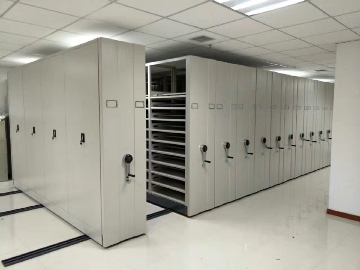 密集架為框架結(jié)構(gòu):由底盤、雙柱、擱板及支承板、頂板、護板、門面、傳動機構(gòu)、道軌、防震裝置及防塵、防鼠裝置等部分組成。節(jié)型、架高、架寬、層數(shù)和列數(shù)均可按用戶需要選定。
