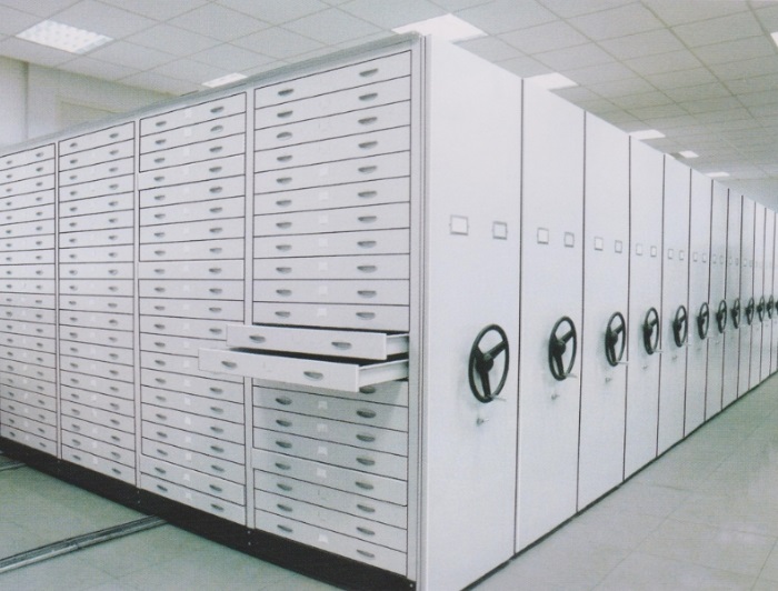 密集架為框架結(jié)構(gòu):由底盤、雙柱、擱板及支承板、頂板、護板、門面、傳動機構(gòu)、道軌、防震裝置及防塵、防鼠裝置等部分組成。節(jié)型、架高、架寬、層數(shù)和列數(shù)均可按用戶需要選定。